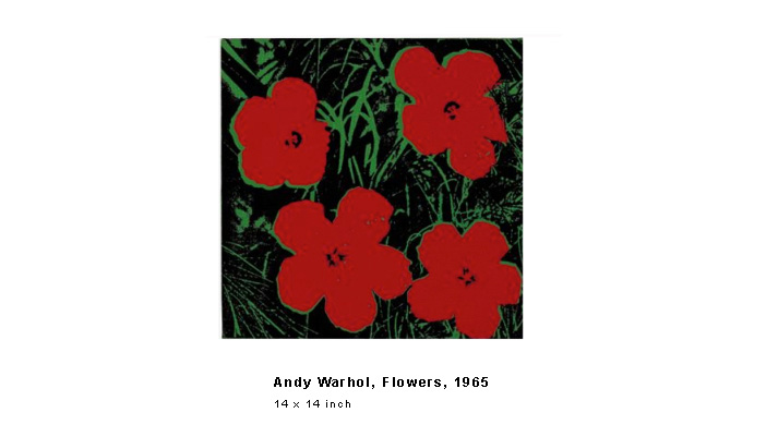 When Andy Warhol first showed his Flower paintings in November 1964, the critics were unsure what type of flowers he had painted: anemones said one, nasturtiums another, pansies a third. In fact they were hibiscus flowers, disguised by the process of transformation from flower to photograph to silkscreen painting.